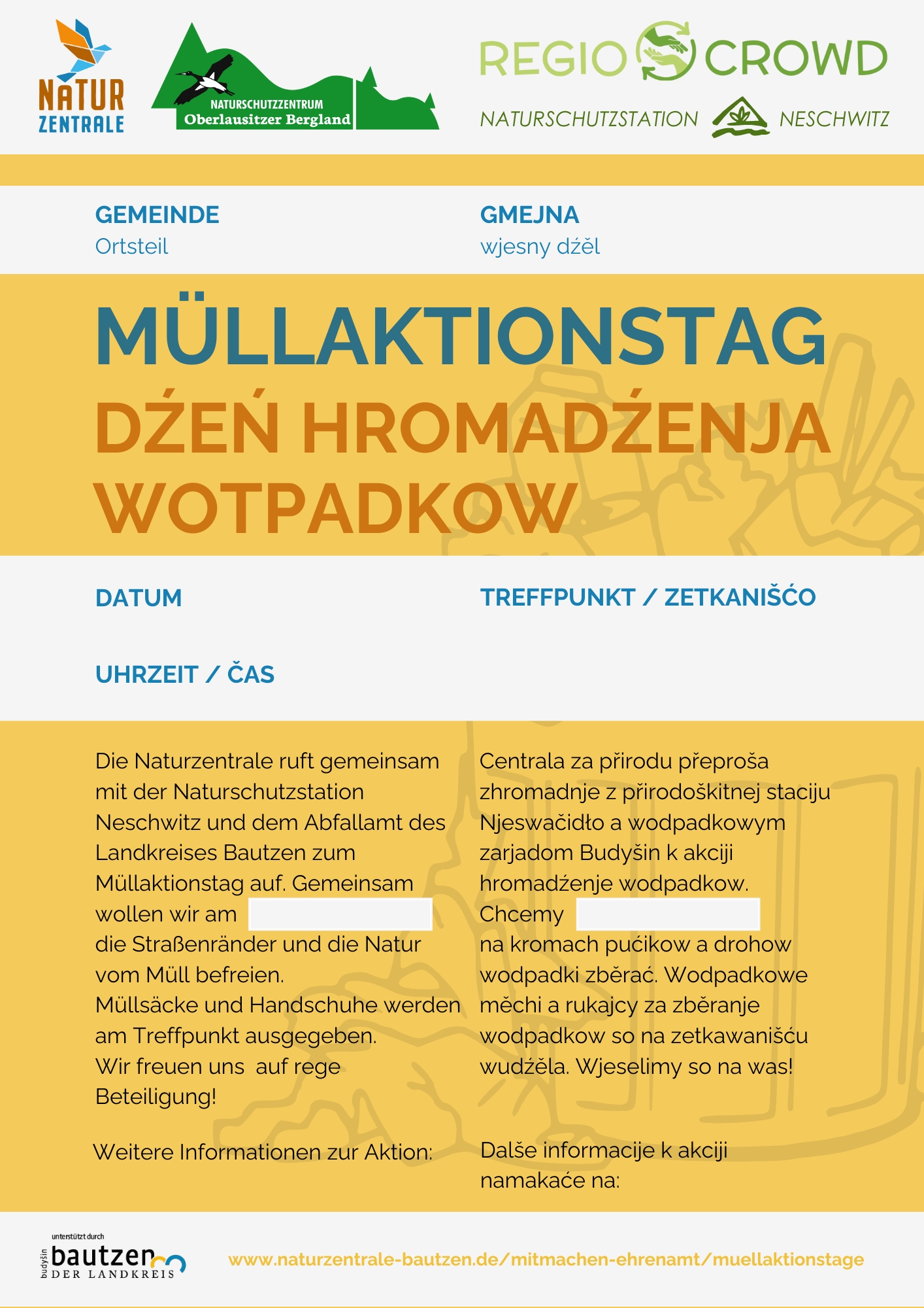 Vom 02. bis 29. März ruft die Naturzentrale gemeinsam mit der Naturschutzstation Neschwitz e.V., dem Naturschutzzentrum „Oberlausitzer Bergland“ e.V. und dem Abfallamt des Landkreises Bautzen zu den Müllaktionstagen auf. Seit vier Jahren krempeln die Menschen hier im Landkreis nun schon regelmäßig, im Zeitraum vor Ostern, die Ärmel hoch und packen gemeinsam an. Ausgerüstet mit Handschuhen und Säcken, ziehen sie durch die Landschaft und sammeln Müll – zum Beispiel jenen Müll, der von anderen achtlos während der Fahrt aus dem Auto geworfen oder einfach im Wald abgeladen wird. Auf diese Weise konnten in den letzten Jahren zahlreiche Containerladungen an Abfall und Schrott gesammelt und schlussendlich fachgerecht entsorgt werden. Hier geht’s nochmal zum ANMELDEBOGEN_MÜLLAKTIONSTAGE 2026.